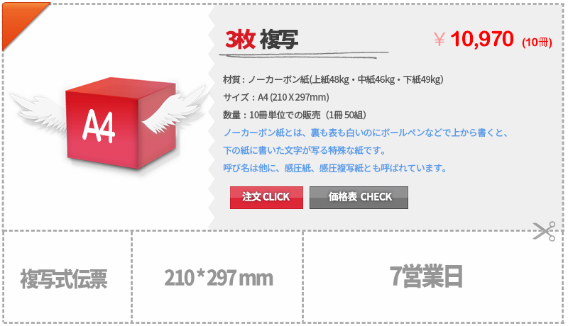 | 材質 | 【複写式伝票】ノーカーボン用紙(上紙:48Kg/中紙:46Kg/下紙:49Kg) |